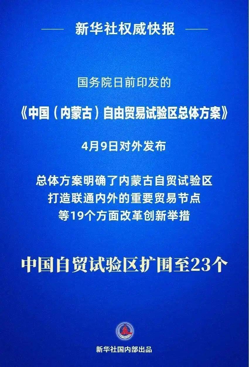 国务院日前印发的《中国(内蒙古)自由贸易试验区总体方案》4月9日对外发布。至此,中国自贸试验区扩围至23个。